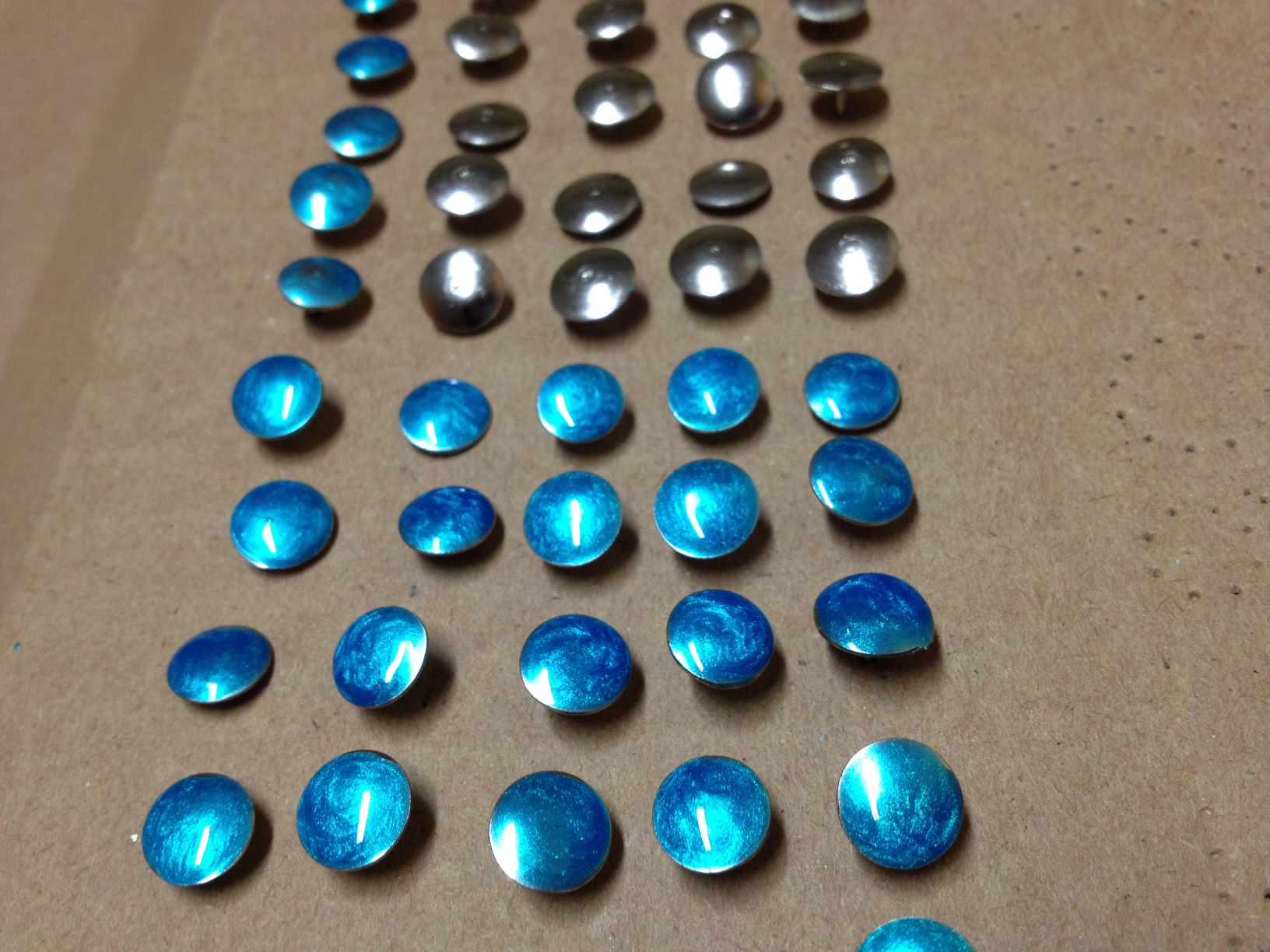 Now for the hardest part of this project: LET THEM DRY! Seriously though. The reason we don’t slather loads of paint on our nails is because they’ll take forever to dry, right? I made the mistake of getting too excited and starting the rest of the process without giving the tacks ample time to dry. (If you look closely, you’ll probably see some nice little fingerprints on my scales!) Test your willpower and see if you can let them dry overnight…