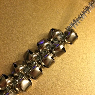 If you want to create an ornament for hanging, leave 2 inches or so unstrung at the ends of the pipe cleaner. This allows you to bring them together at the top, bending the whole bells structure into a circle. Give it a twist or two to create & secure the wreath shape.